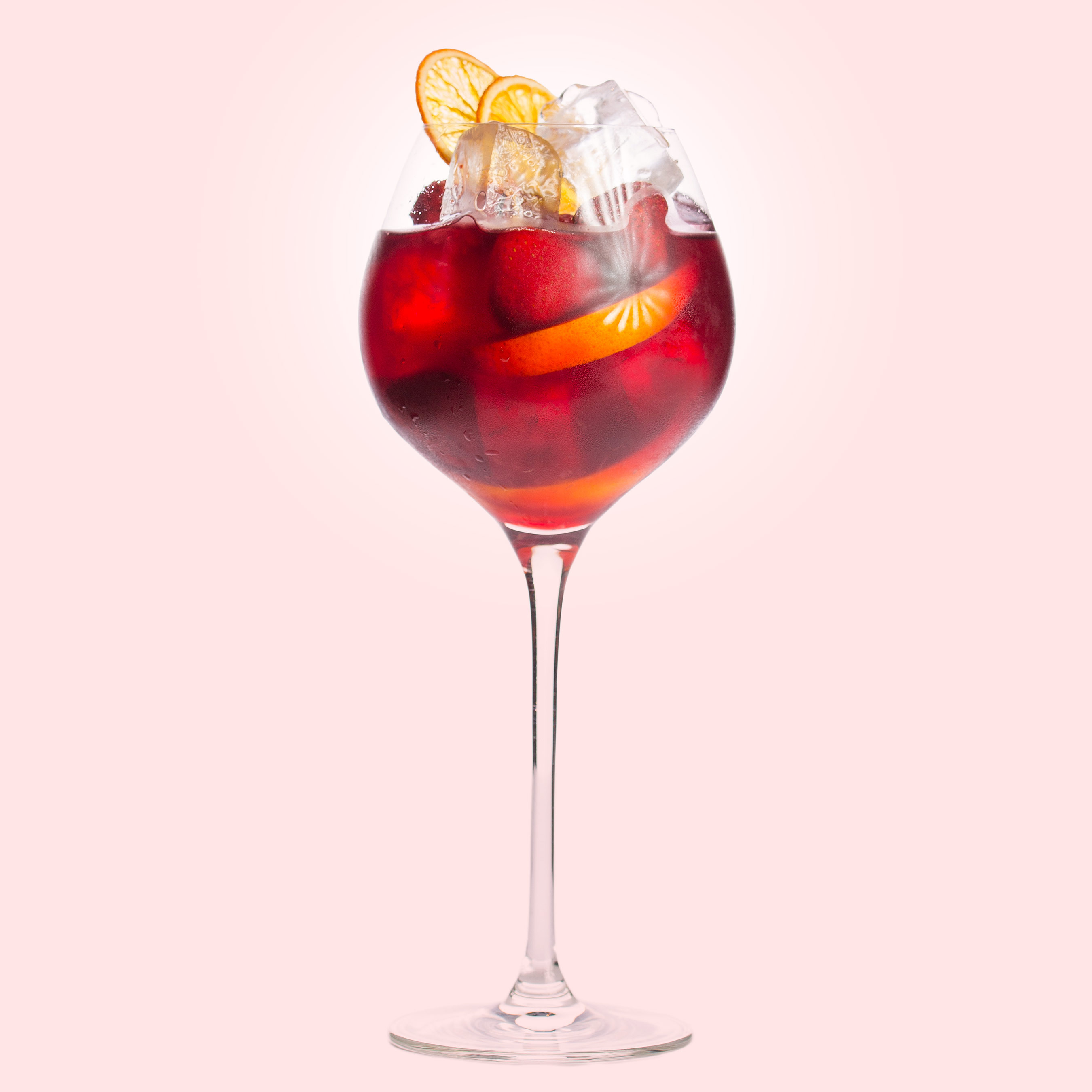 Avkjøl alle ingrediensene på forhånd - gjerne over natten. Bland rødvin, druebrennevin, sitruslikør, sukkerlake og all fruktjus godt. Sil, med en stor sil, over i en avkjølt glassbolle. Glassbollen kan avkjøles med en pose med isbiter på forhånd - men sangriaén skal ikke serveres med isbiter. Tilsett ingefærøl og sodavann. Rør lett en gang. Tilsett garnityr. Server.